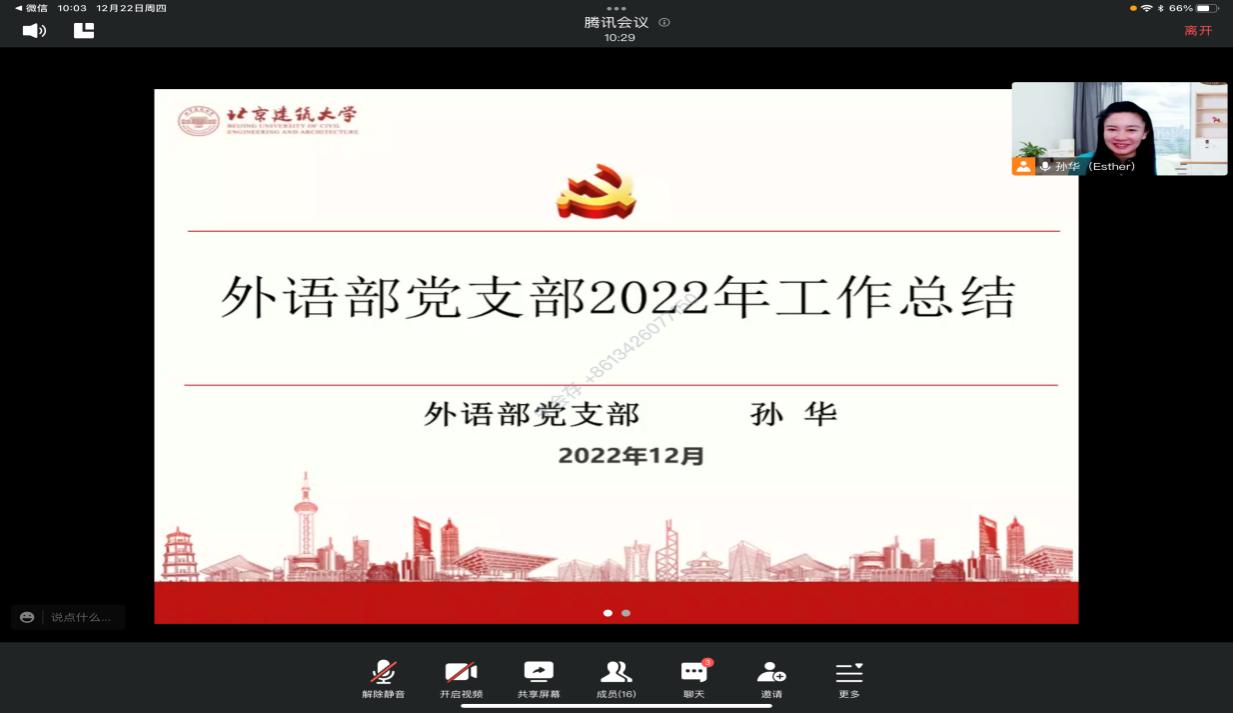 12月22日上午10点,外语部全体党员通过腾讯会议召开了支部党员大会,支部书记孙华代表党支部总结本学期党支部工作和对下学期工作展望。与会者积极发言讨论,会议气氛热烈。本学期支部完成了既定的“三会一课”、主题党日等活动。党员们回忆起结合学习宣传贯彻党的二十大精神,以主讲主问形式举行的“为党育人,为国育才,与建大同行——教学相长青年教师职业发展规划”主题党日活动,仍津津乐道,回味无穷。党员们在听取本学期支部工作总结后,纷纷表示要发挥先锋模范作用,有序做好本学期期末监考、阅卷等各项工作,同时以十足的信心和干劲全身心投入下学期各项准备工作。