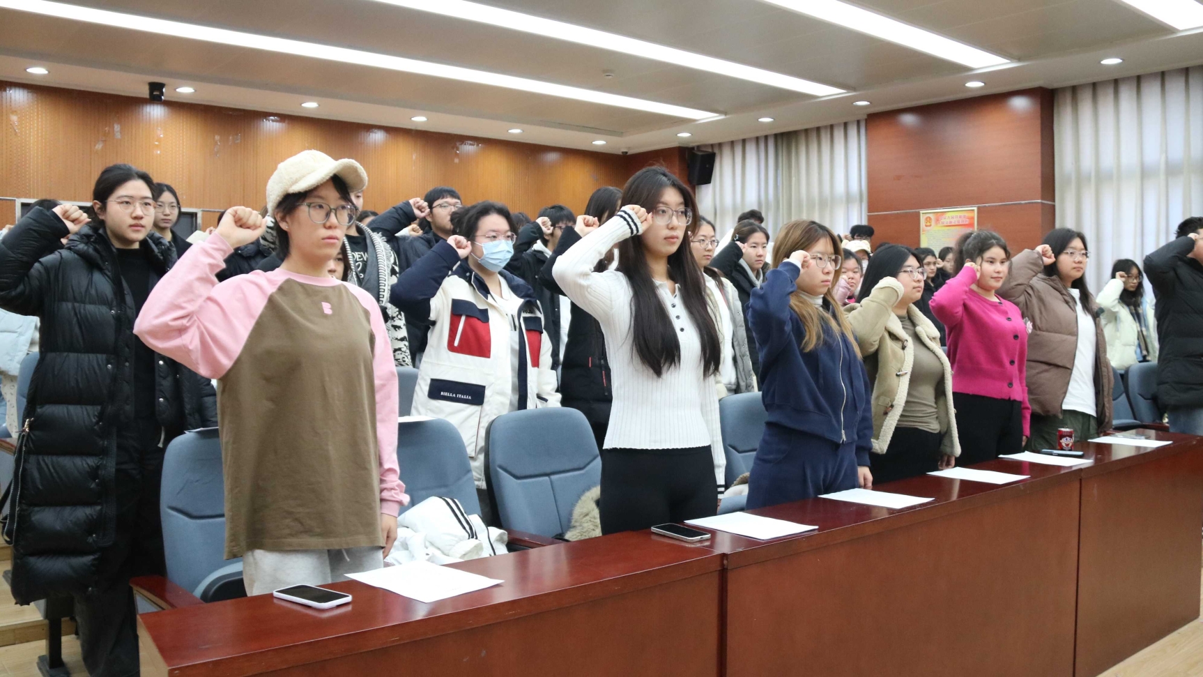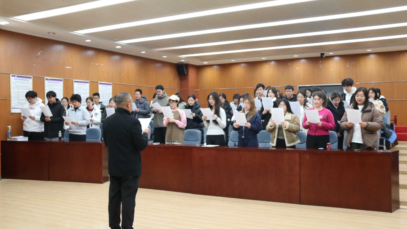 当天上午,四川麻将在线 组织法律系大一新生在基D118模拟法庭教室整齐列队,庄严宣誓。宣誓仪式上,同学们右拳高举,神情肃穆,一起做出庄严承诺。