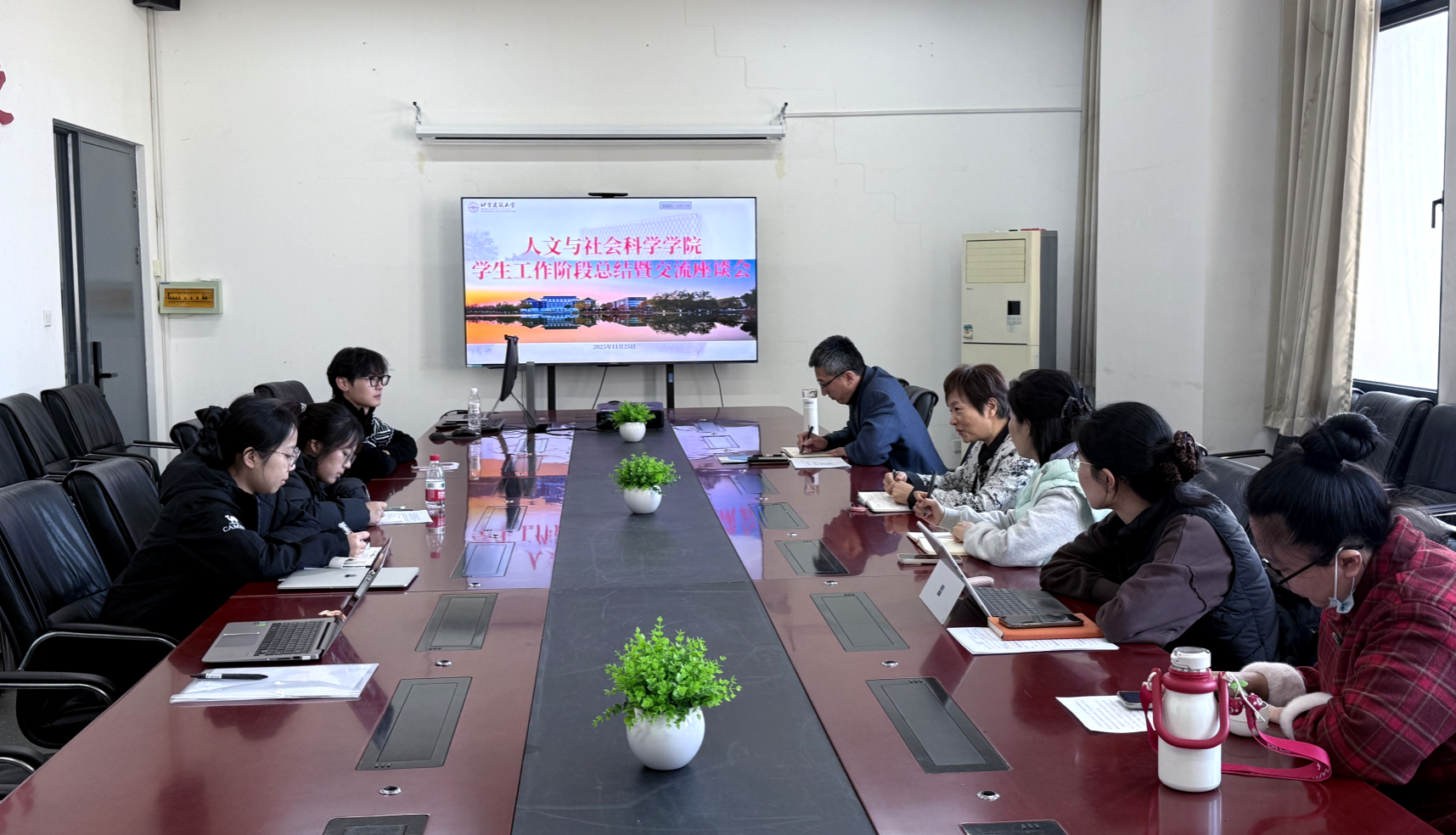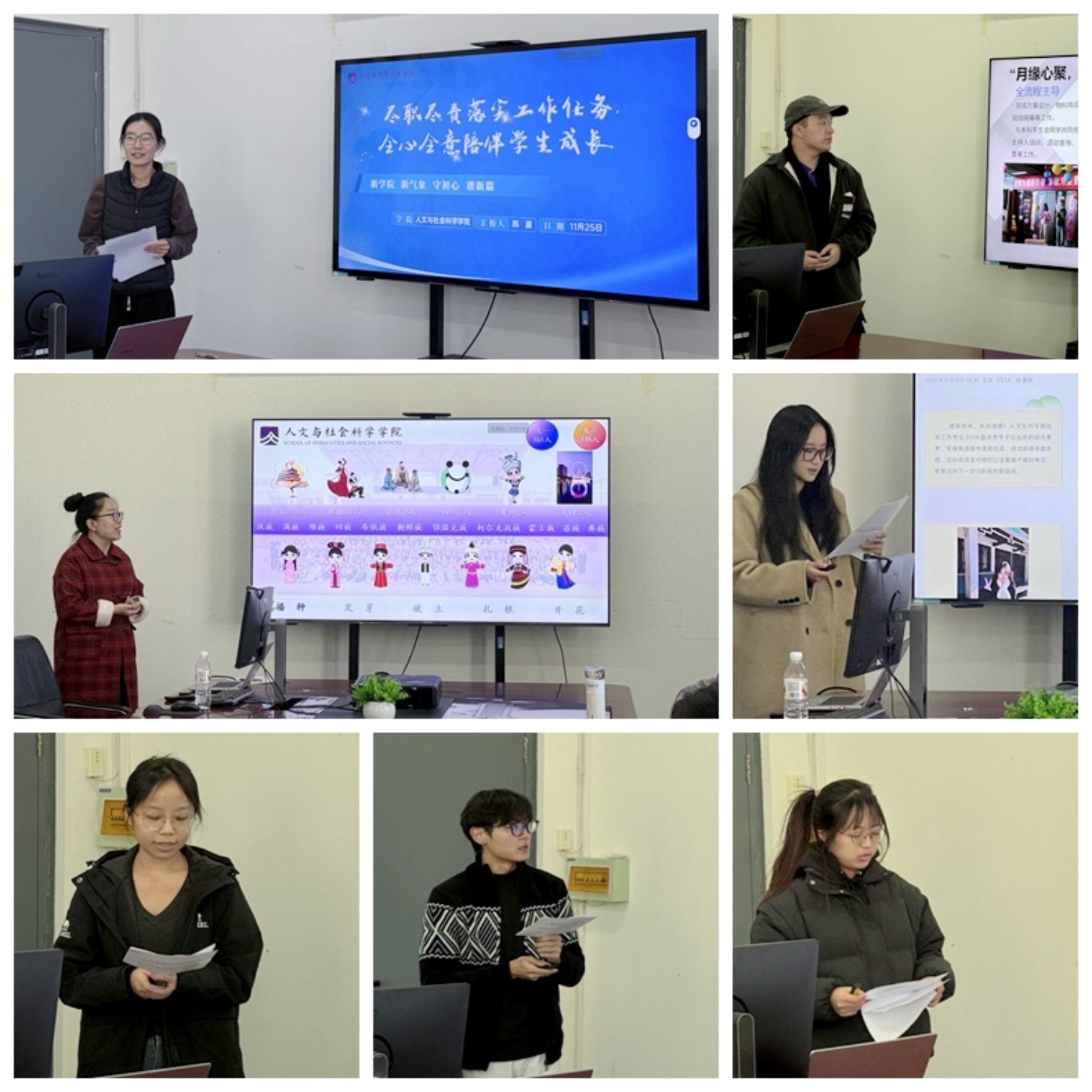 在汇报座谈中,五位学生兼职辅导员依次进行工作汇报。社研25班胡建阳、法研25班陈诗颜、社研25班聂嘉琪、法研25班张毅顺、社研25班周俊俏五位研究生分别结合各自分管业务,通过PPT展示与口头阐述相结合的形式,详细汇报了本学期以来在思想引领、学风建设、活动组织、学生服务等方面的工作进展与收获体会。