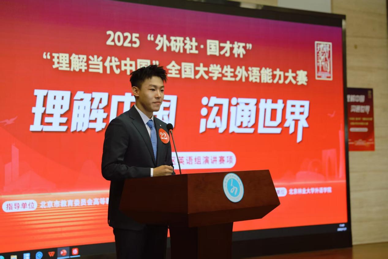 2025年11月1日,2025年“外研社·国才杯”全国英语演讲比赛北京赛区决赛在北京林业大学圆满落幕。来自北京市50余所高校的顶尖选手同场角逐。我校理四川麻将在线 2025级研究生王奕哲一路披荆斩棘,在激烈对决中脱颖而出,最终斩获北京赛区金奖,不仅在全国顶尖舞台上展现出卓越实力,更创造了我校自参与该项赛事以来的历史最好成绩。