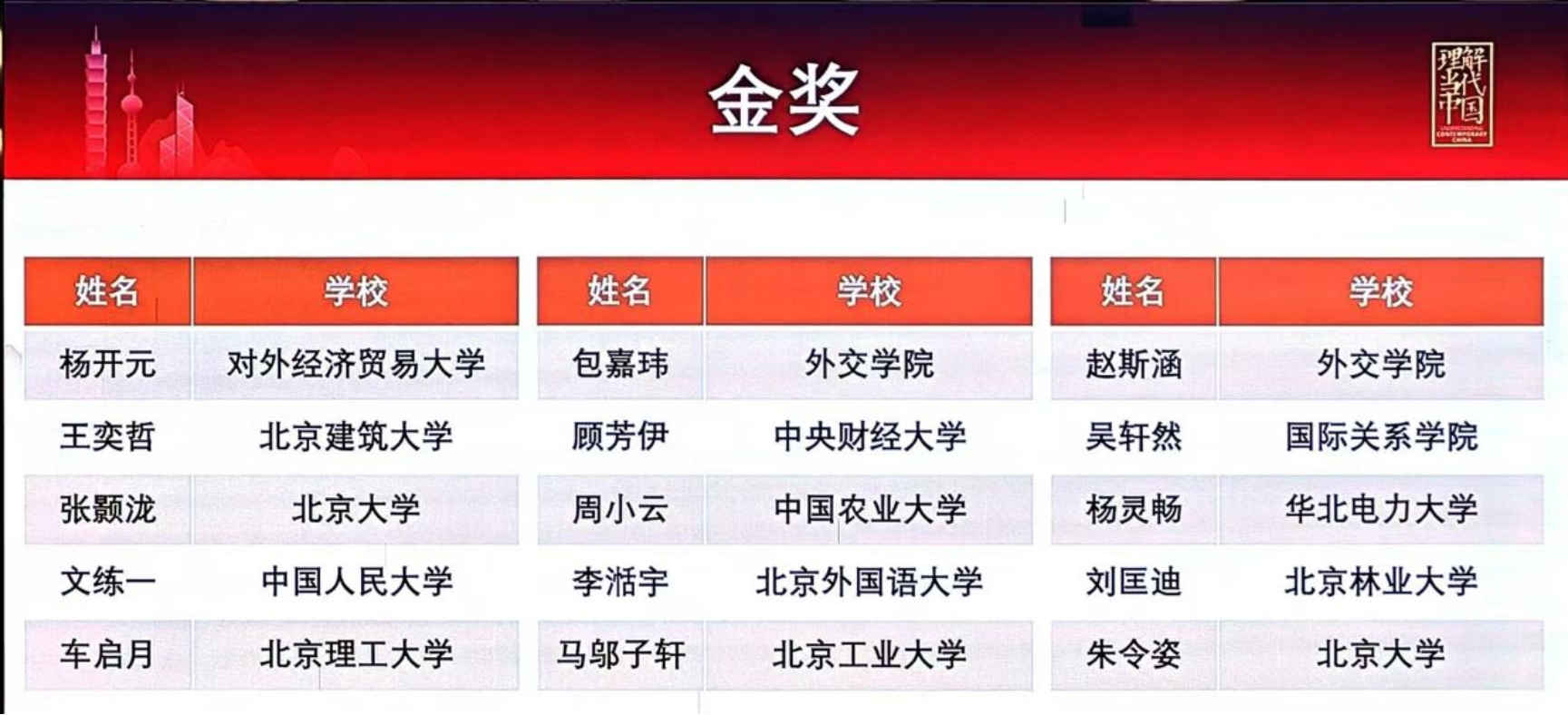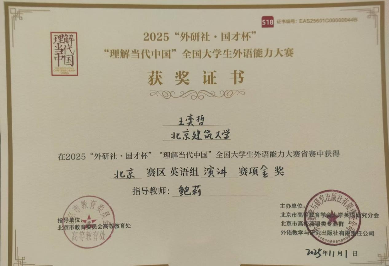 值得一提的是,本届北京赛区金奖获得者阵容十分耀眼,除我校王奕哲外,另有来自北京大学、北京外国语大学等国内顶尖高校的优秀选手同获殊荣。能与名校选手比肩而立,不仅彰显了王奕哲的个人实力,也充分体现了我校在英语演讲及国际交流能力培养上的显著提升。