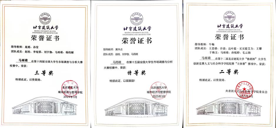 勇于挑战自我,不断突破自己的极限,在各类竞赛中屡获佳绩。荣获第十四届“挑战杯”秦创原中国大学生创业计划金奖等国家级2项,“青创北京”挑战杯首都大学生创业计划竞赛金奖、全国大学生房地产策划大赛华北赛区二等奖、中国国际“互联网+”大学生创新大赛铜奖等省部级奖项16项。这些竞赛不仅锻炼了她的实践能力和团队协作能力,也提升了她的创新思维和解决问题的能力。