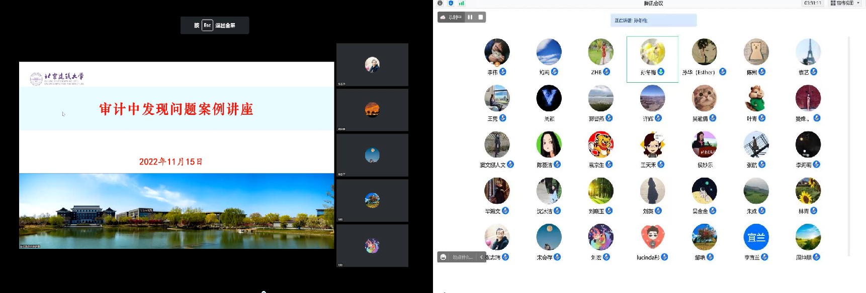 院长秦红岭、书记孙冬梅分别传达了2022年全国、北京市和北京市教育系统审计会议精神以及张大玉校长和黄京红书记在学校2022年审计工作会议上的讲话精神,审计处孙文贤处长应邀就审计中发现的问题以案例形式进行了专题讲座。大会还强调了疫情防控的相关要求。