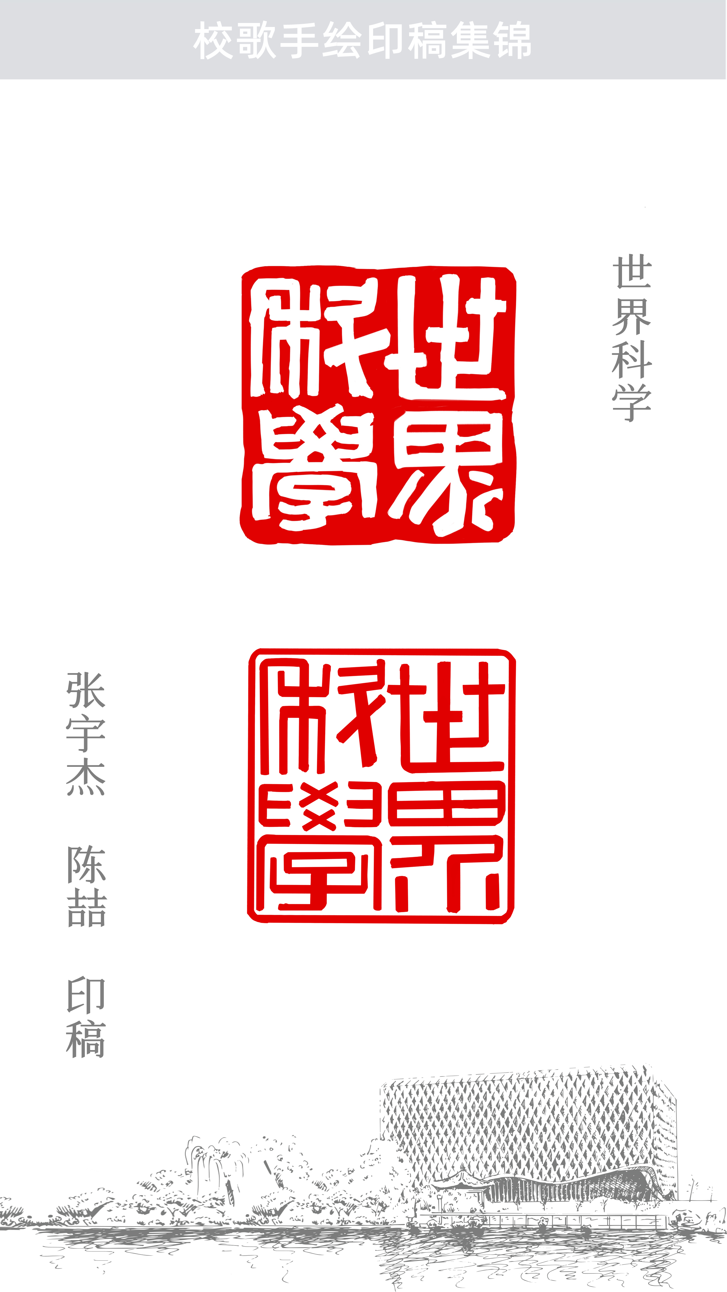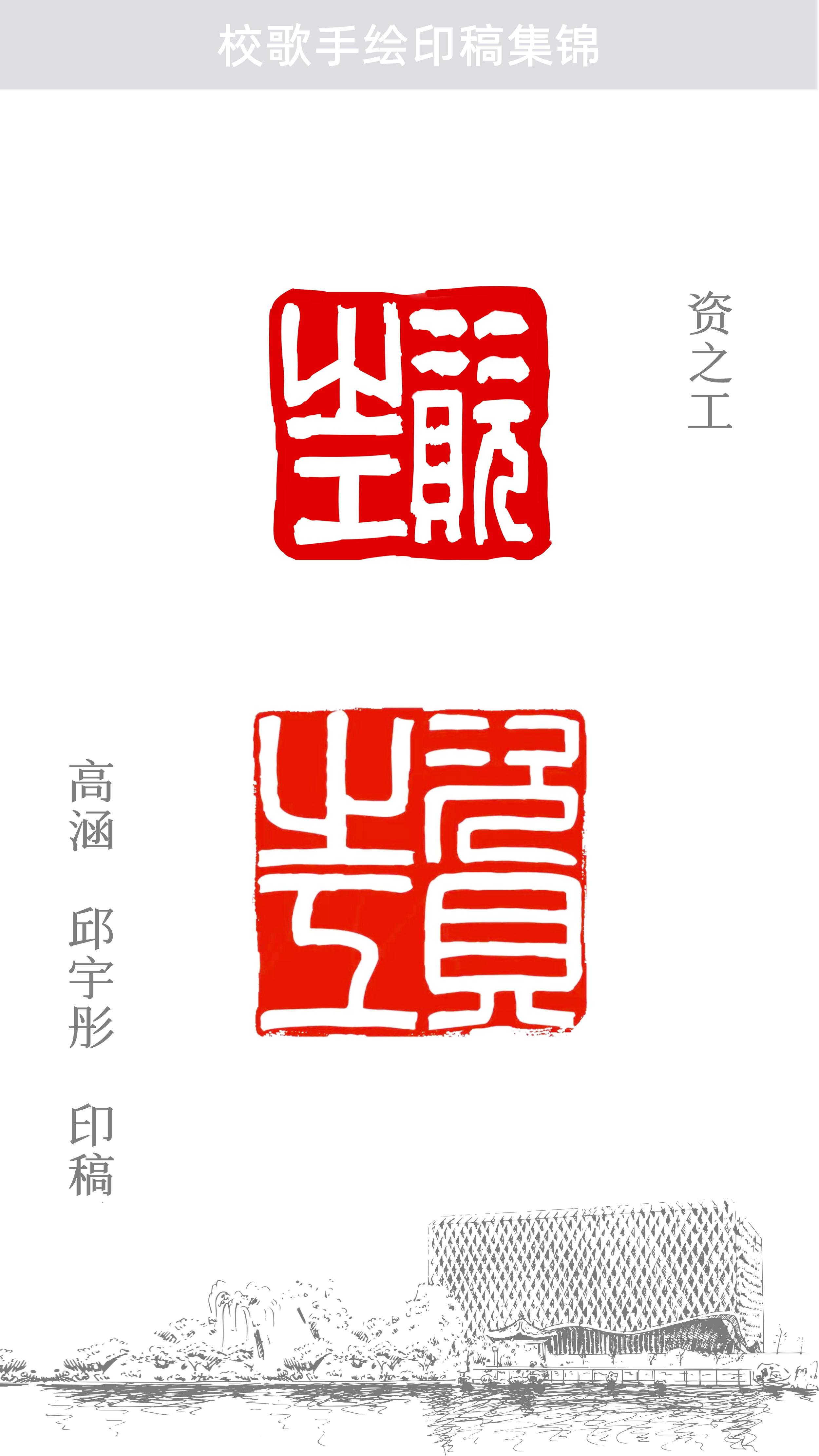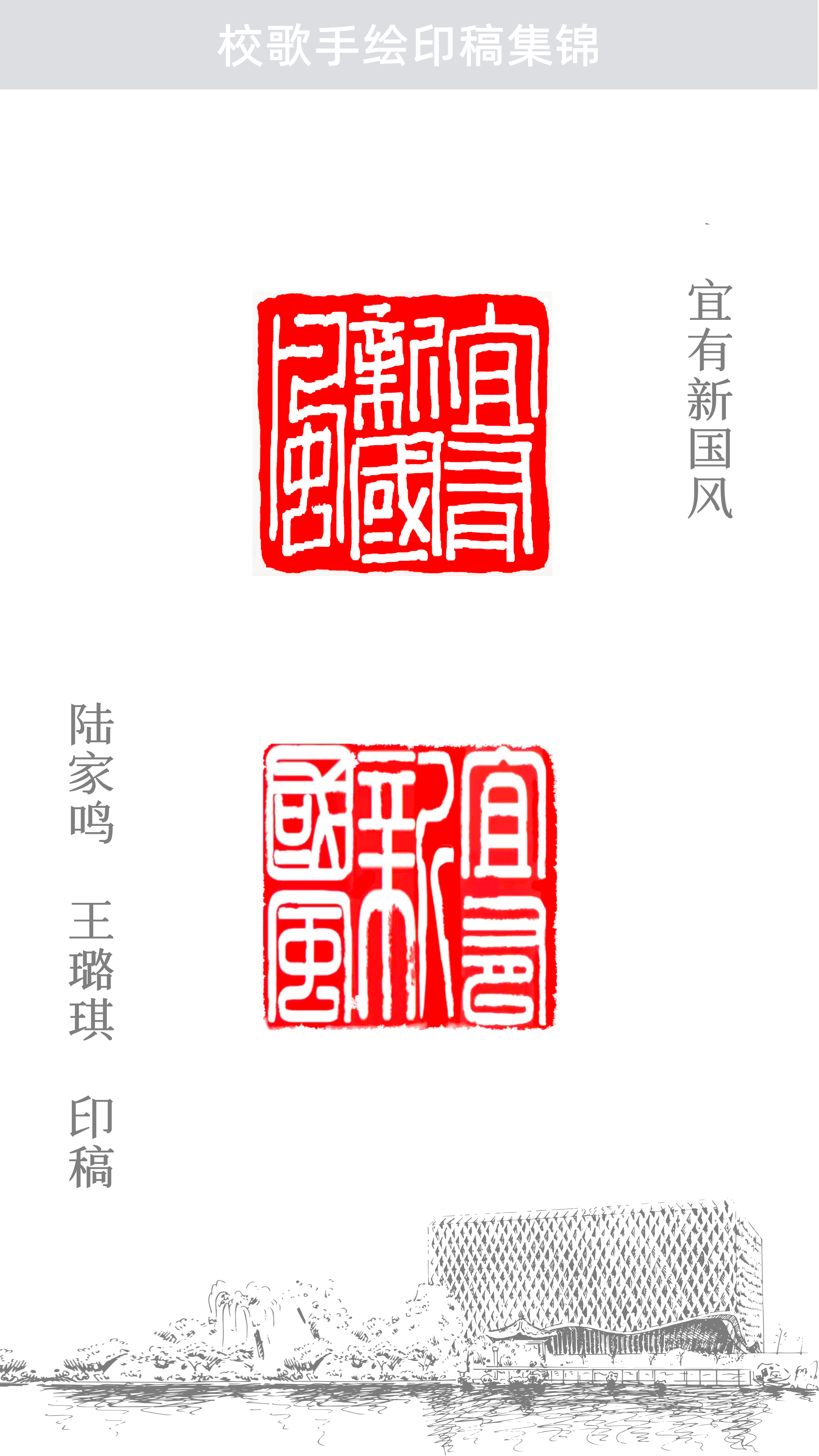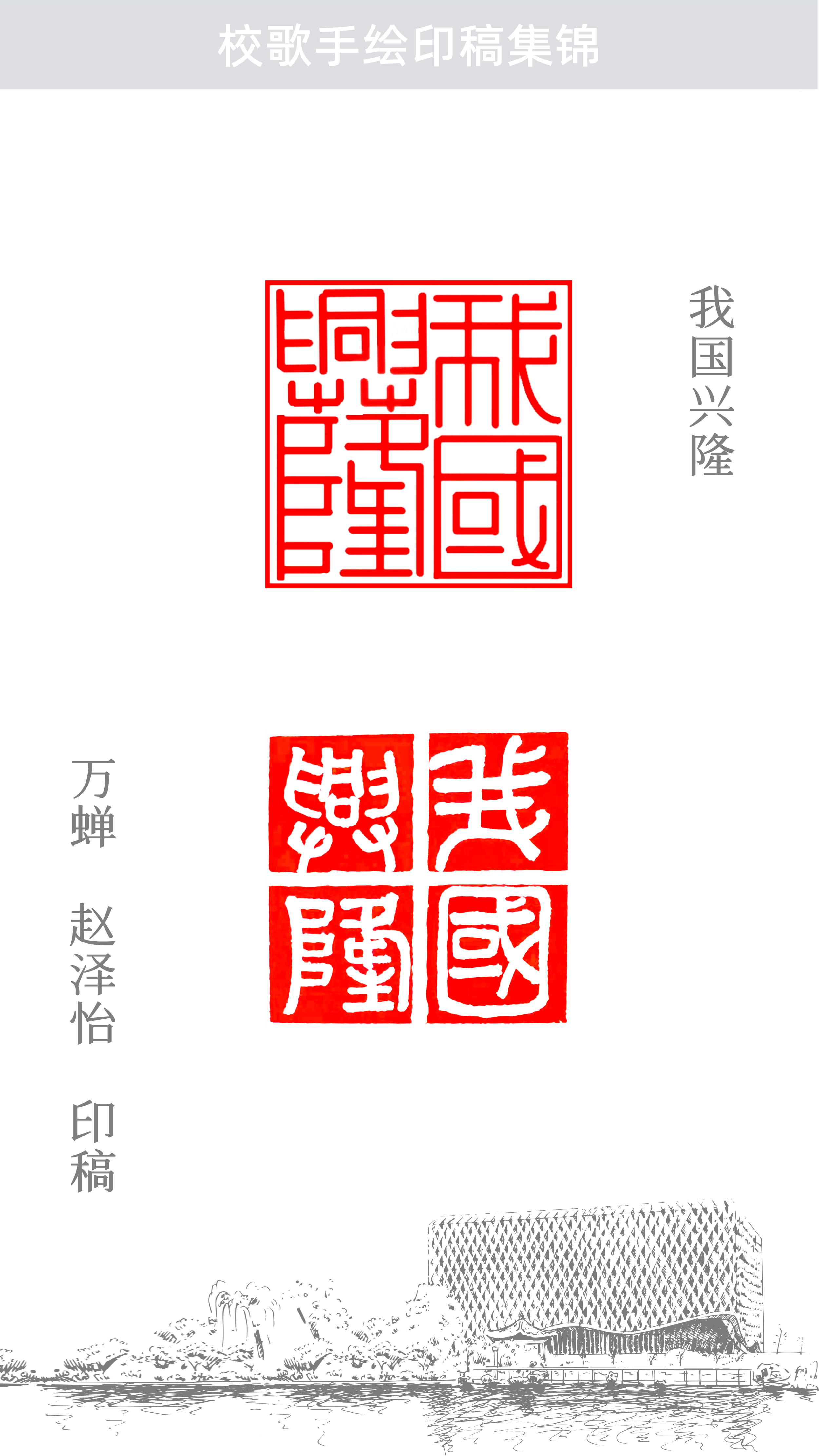 随风潜入夜,润物细无声。艺术创作的过程交织在教与学、课上与课下、书法篆刻与校史文化、历史与现代等信息融合的氛围之中,置身其中,仿佛被一种无形的力量笼罩着,不知不觉浸润身心,这何尝不是师生在用一种别致的艺术形式同“唱”校歌!希望大家能从这首手绘印稿校歌中体会到文化育人的初心、艺术创作的匠心、文化自信的信心。