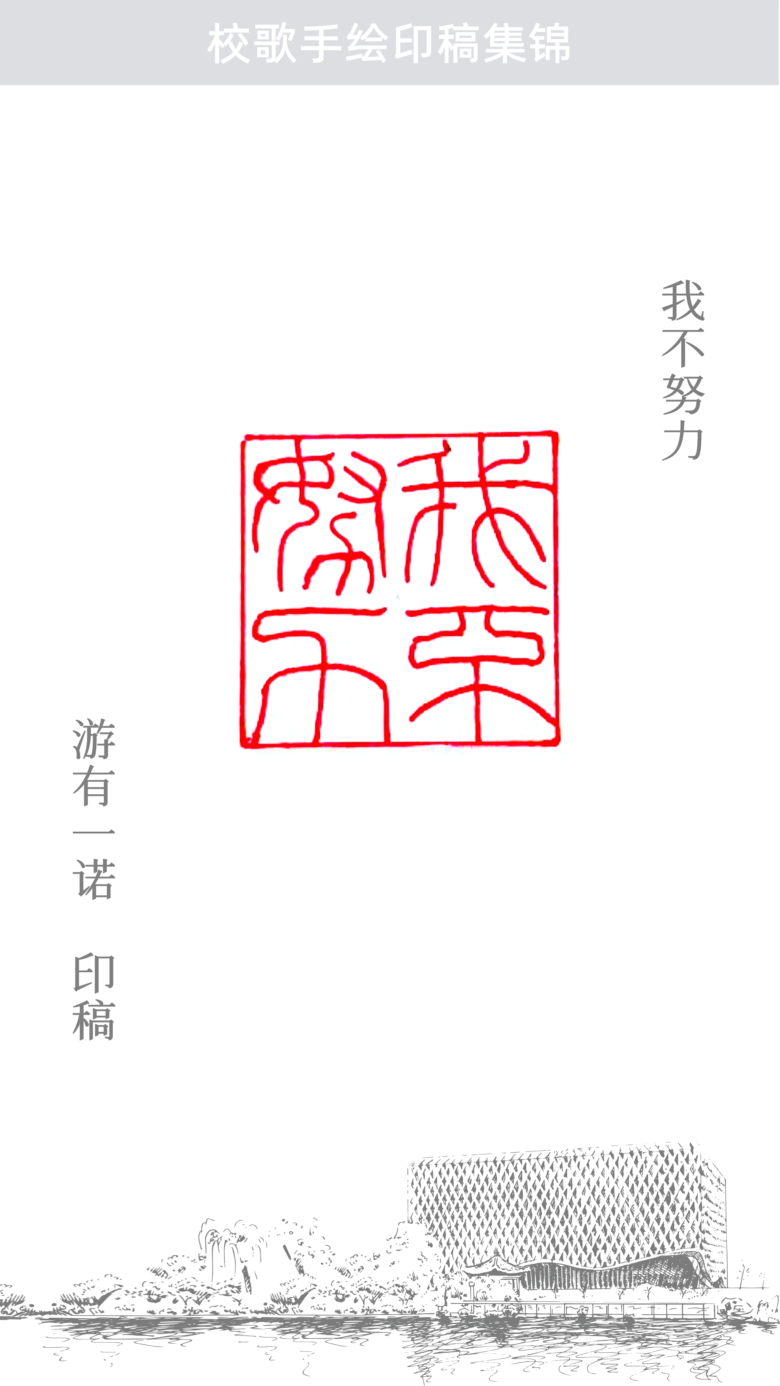 这方印稿的内容是“校歌”二字。其中融入了学校明湖中荷花与鱼的元素,构成一幅和谐的画面。融合了传统篆刻与大众篆刻的特点。北京建筑大学办学百余年,学校里有学生的书声朗朗,有老师的谆谆教导,有特色建筑的气派辉煌,也有鱼戏莲叶间的美好景象。鱼儿鲜活的生命力也象征着我们的母校永葆初心,如月之恒,如日之升。
