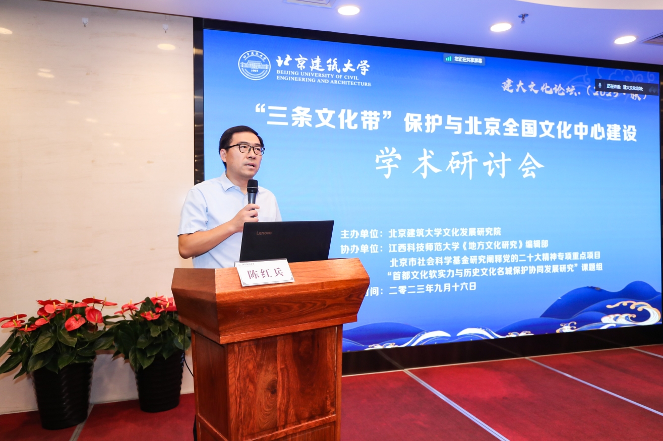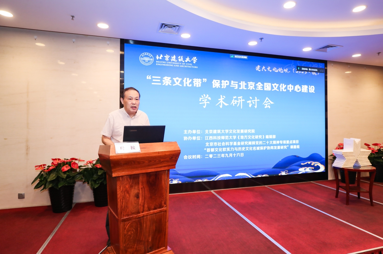 江西科技师范大学《地方文化研究》主编叶桉教授代表协办方致辞。北京建筑大学党委常委、副校长陈红兵代表学校对各位专家、学者莅临表示欢迎和感谢。他指出,北京建筑大学是北京市和住房城乡建设部共建高校、教育部“卓越工程师教育培养计划”试点高校、北京市高水平特色型大学和北京市党的建设和思想政治工作先进高校。作为北京地区唯一一所建筑类高等学校,学校始终坚持“建筑味十足,北京味十足”的办学特色。文化发展研究院以北京建筑大学特色优势学科为依托,整合全校相关科研机构及文化优质资源,聚焦首都全国文化中心建设,开展北京文化发展战略、北京文化遗产保护与活化利用、北京建筑文化、北建大精神与文化形象展示等方面研究,致力于成为北京建筑和城市文化领域的智库型研究平台。本次“三条文化带保护与北京全国文化中心建设”学术研讨会是学校和文化发展研究院服务北京全国文化中心建设的具体举措。