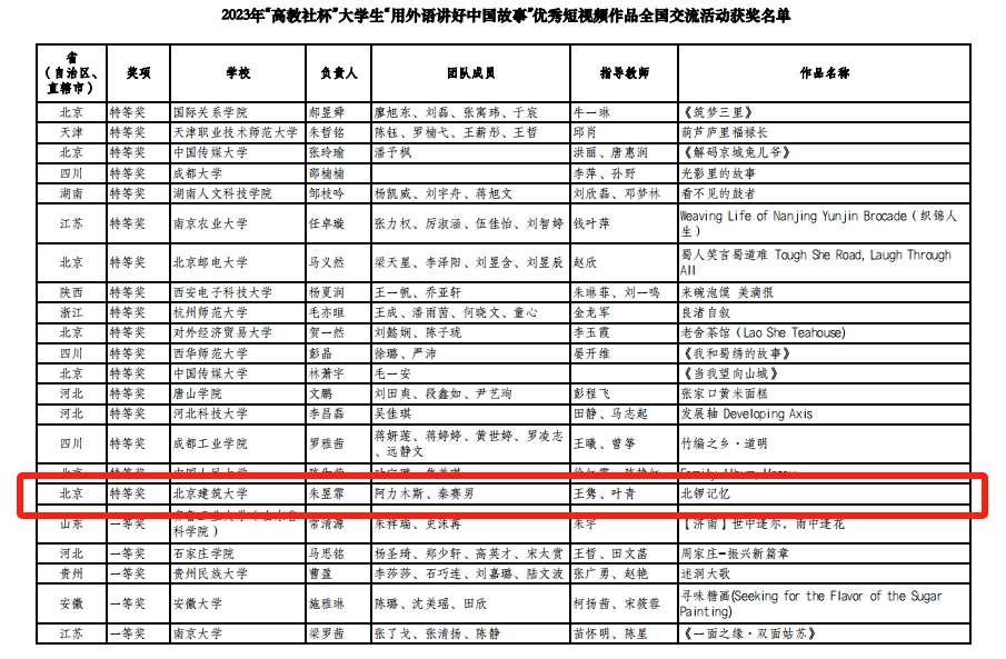 近日,2023年“高教社杯”大学生“用外语讲好中国故事”优秀短视频作品全国交流活动在南京大学苏州校区落下帷幕,由我校经管四川麻将在线 学生朱昱霏、阿力木斯、秦赛男制作,人文四川麻将在线 王隽、叶青两位老师指导的作品《北锣记忆》受邀参加线下交流活动并获得全国特等奖。