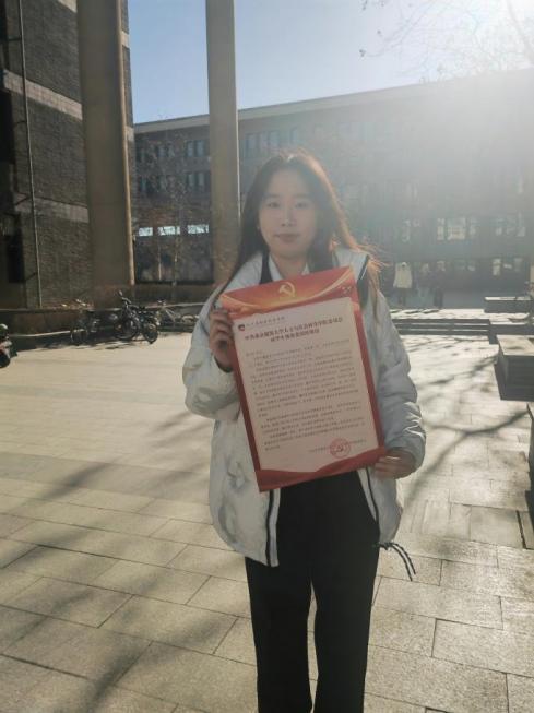 张乐宜自被发展为预备党员以来,积极投入支部建设工作,参与微党课评比活动,组织召开支部党员大会、主题党日活动;她坚持理论与实践深度融合,先后赴京报馆旧址追溯红色新闻事业发展脉络,在“一二·九”主题展览中感悟青年运动精神。她用实际行动诠释着新时代青年党员“请党放心,强国有我”的铮铮誓言,曾获评校级优秀共青团员荣誉称号。