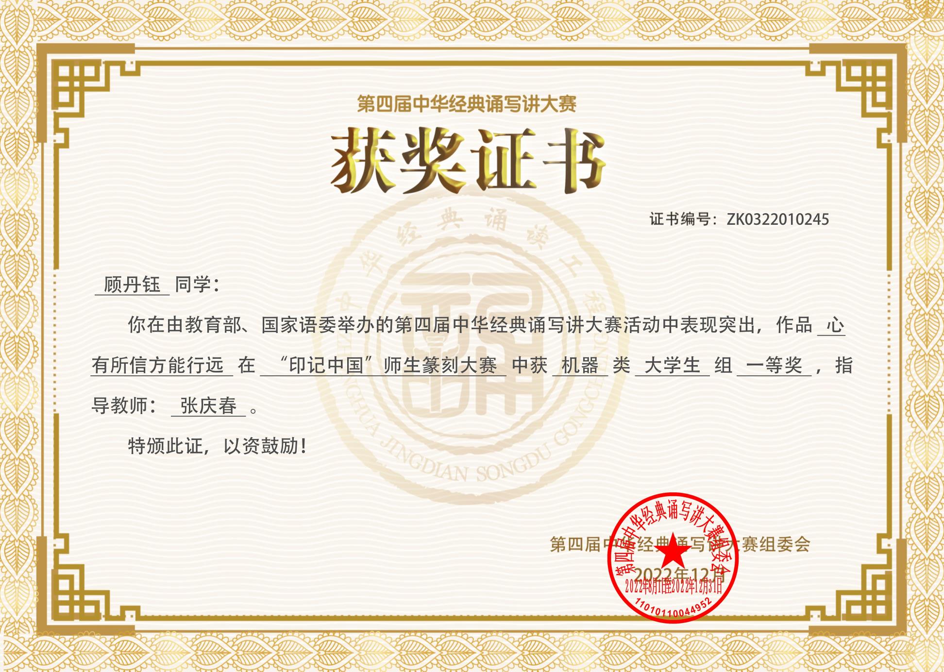 雅言传承文明,经典浸润人生。日前,由文发院指导推送的社192班顾丹玉等5名同学的篆刻作品、城181班刘琼临等9名同学的书法作品,分别参加了第四届中华经典诵写讲大赛“印记中国”师生篆刻大赛、“笔墨中国”汉字书写大赛两个分赛项,在北京初赛与全国决赛中均取得优异成绩。