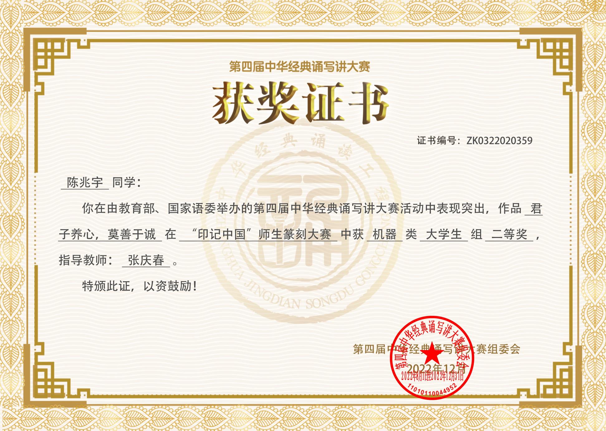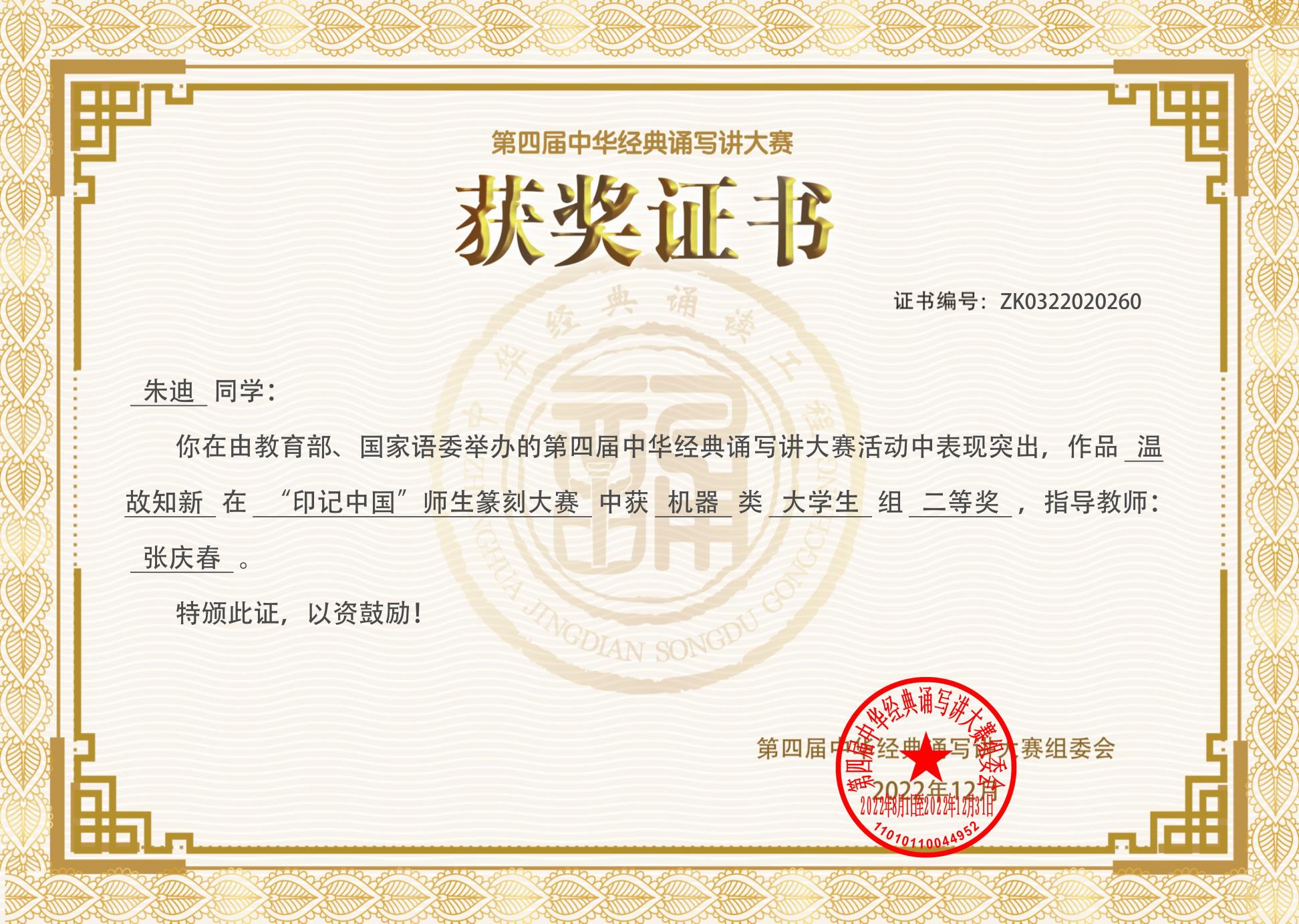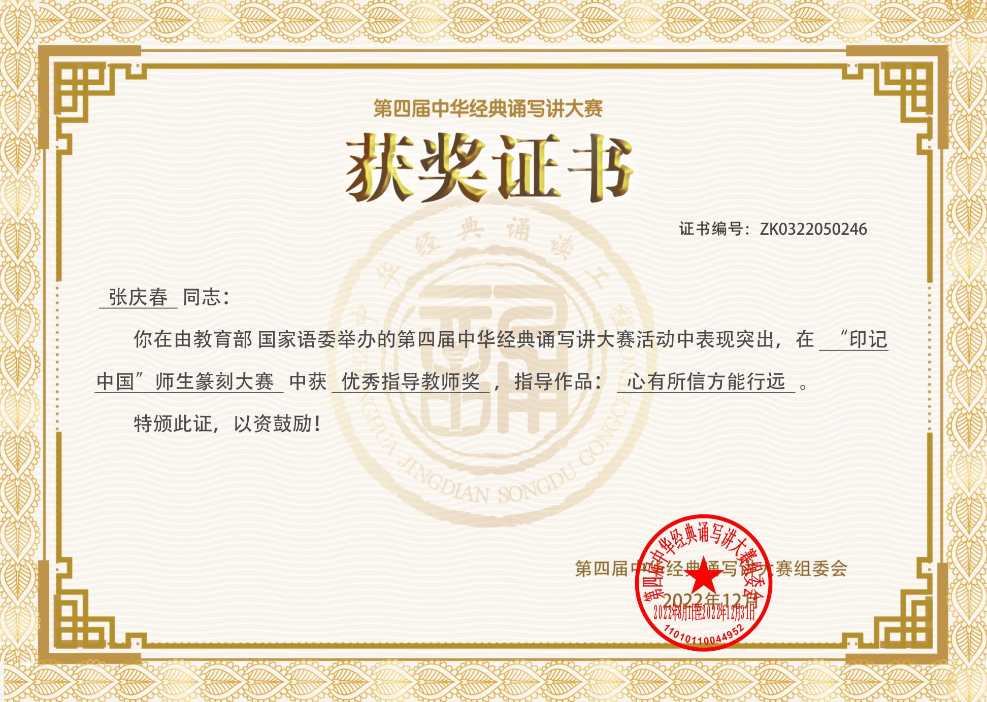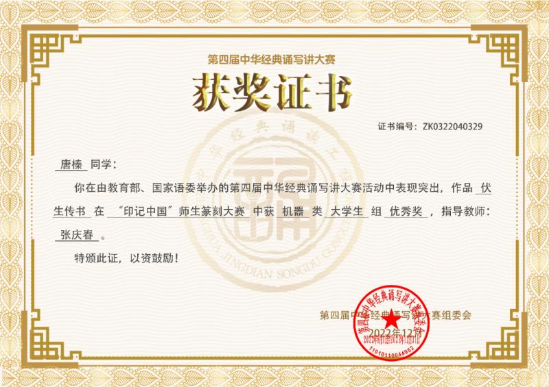 学校通识核心课《中国书法篆刻(工作坊)》主讲老师张庆春被评为北京初赛、全国决赛优秀指导教师奖。至此,张庆春老师已连续三届获得优秀指导教师奖项。2022年4月开赛报名后,他为适应新冠疫情防控形势专门组织了线上培训班,除统一讲解基础知识外,还针对每位参赛学生的具体情况制定了一生一策的个性化的指导方案,加强了作品创作实践中各个环节的指导力度,收到了良好的教育效果。