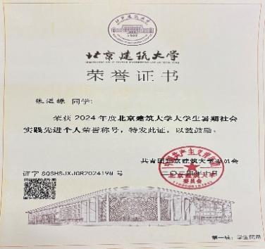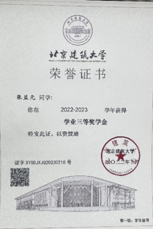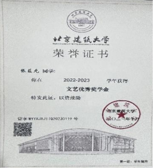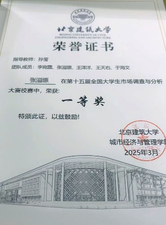 在学业方面,她始终保持着积极进取的精神。荣获综合一等奖学金、体育优胜奖学金,院级“三好学生”以及北京建筑大学“优秀学生”荣誉称号。在体质健康测试中,以103.5分的优异成绩,充分展现了自己良好的身体素质与积极向上的健康状态,实现了全面发展。此外,她也积极参与各类学术竞赛和活动,获第六届“志远杯”全国建筑类院校大学生建筑法律文书大赛二等奖、MCM/ICM美国大学生数学建模竞赛M奖、全国大学生市场调查与分析大赛校级二等奖、北京建筑大学“鲁班杯”院级大学生创新竞赛二等奖等。