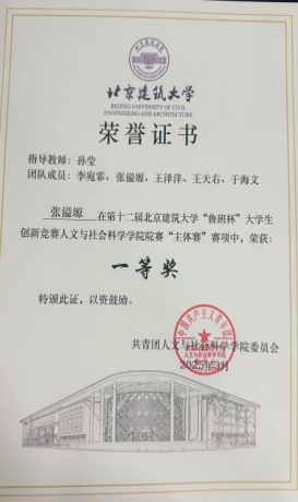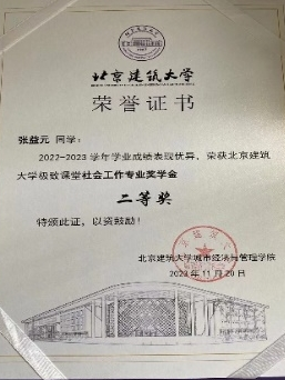 张溢塬同学始终坚信“立身以立学为先,立学以读书为本”,她深知学习的重要性。大学期间,她凭借不懈努力取得优异成绩,GPA达到3.8,平均分90.8,并因此荣获北京建筑大学2022-2023学年学业三等奖学金、2022-2023学年极致课堂社会工作专业奖学金二等奖。在学术竞赛中,她与团队成员在专业老师的指导下紧密协作,在第十二届北京建筑大学“鲁班杯”院赛中同时获得一等奖、二等奖,在第十五届全国大学生市场调查与分析大赛本科组校赛中荣获一等奖,这些成绩充分展现出她的专业素养和创新能力,为同学们树立了良好的学习榜样。