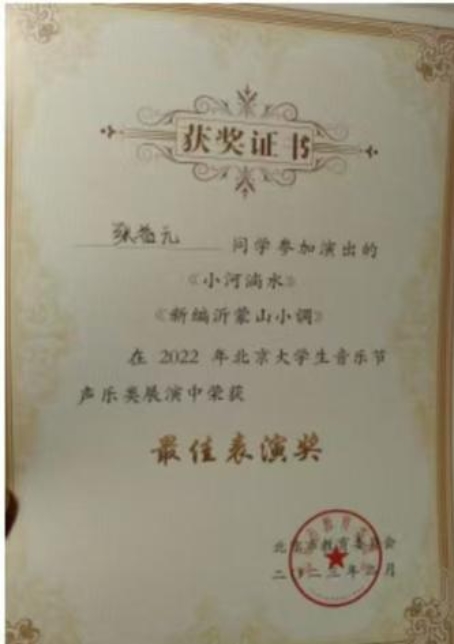 张溢塬自大一加入学校合唱团便积极投身于每场演出活动,其中包括学校大学生艺术节开幕式、闭幕式、团拜会、毕业典礼等10余场演出。在日常训练中,她认真积极、不断提高自己的专业水平。在2022年和2024年“北京大学生艺术节”比赛中,她参与的演出分别荣获了“最佳表演奖”和“金奖”的好成绩,在此之间,她还获评北京建筑大学2022-2023学年文艺优秀奖学金。