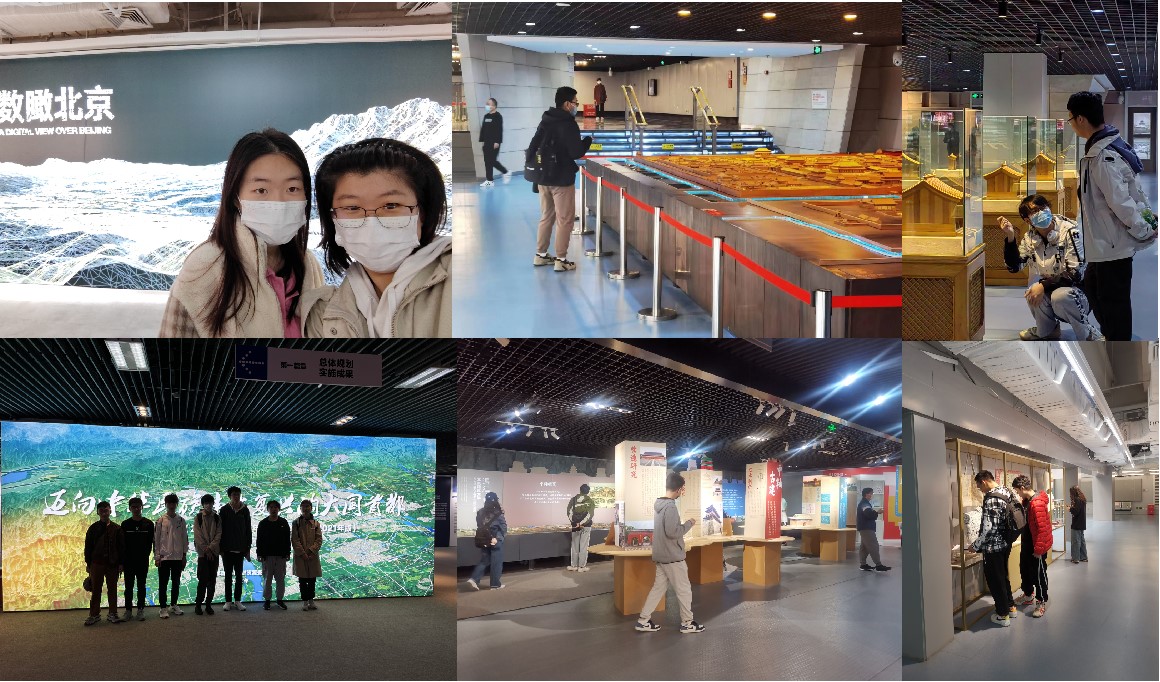 课前,带队老师向学生介绍了北京规划展览馆的基本情况,并提供了每层楼的参观“线索”。随后,学生们分为不同小组,以拍照打卡的形式参观了北京湾、城市脉络、北京一九四九等创意雕塑作品,以及“遇建·中轴——北京建筑大学师生建筑文化研究专题成果展”、“迈向中华民族伟大复兴的大国首都——《北京城市总体规划(2016年—2035年)》实施成果展”、“数瞰北京”测绘和空间大数据建设成果展、“新中国大工匠智慧——数字设计 科技冬奥”展等主题展览,还观看了《不朽之城》、《古都巨变》影片。丰富多样的形式让学生们对北京城市规划和建设有了更深入的认识。
