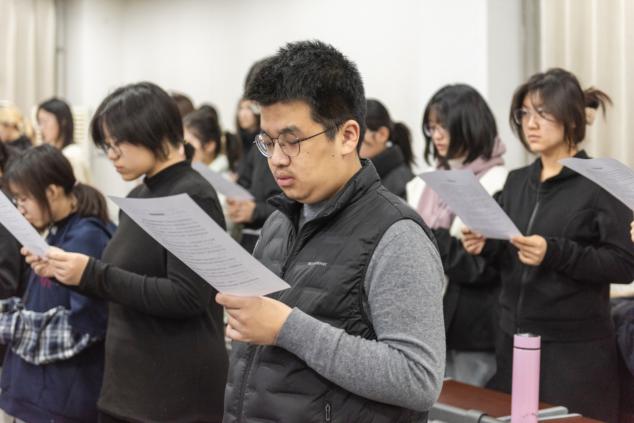 “我宣誓:忠于中华人民共和国宪法,维护宪法权威,履行法定职责,忠于祖国、忠于人民,格尽职守、廉洁奉公,接受人民监督,为建设富强民主文明和谐美丽的社会主义现代化强国努力奋斗!”50余名同学将右拳高高举起,在领誓人的带领下郑重宣誓。