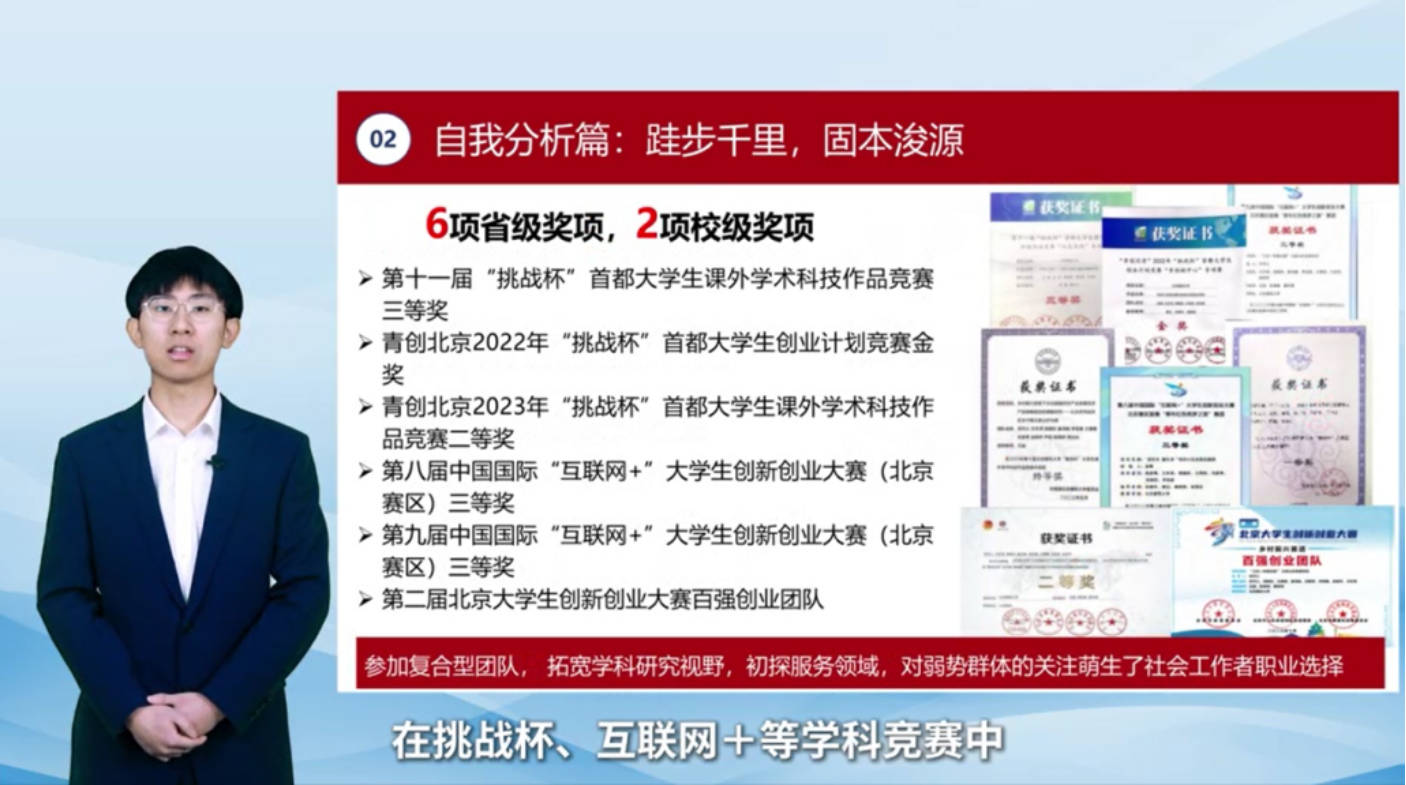 伴随大赛落下帷幕,指尖四川麻将电脑版 社会工作系24级研究生王忻淇获得北京市高教研究生组铜奖。王忻淇同学立足专业特色与优势特点,锚定医务社会工作者的职业目标,坚持“以生命影响生命”的价值理念,聚焦多段社会工作者的实习经历,从职业价值观和实践能力出发,讲述自己的职业规划蓝图。