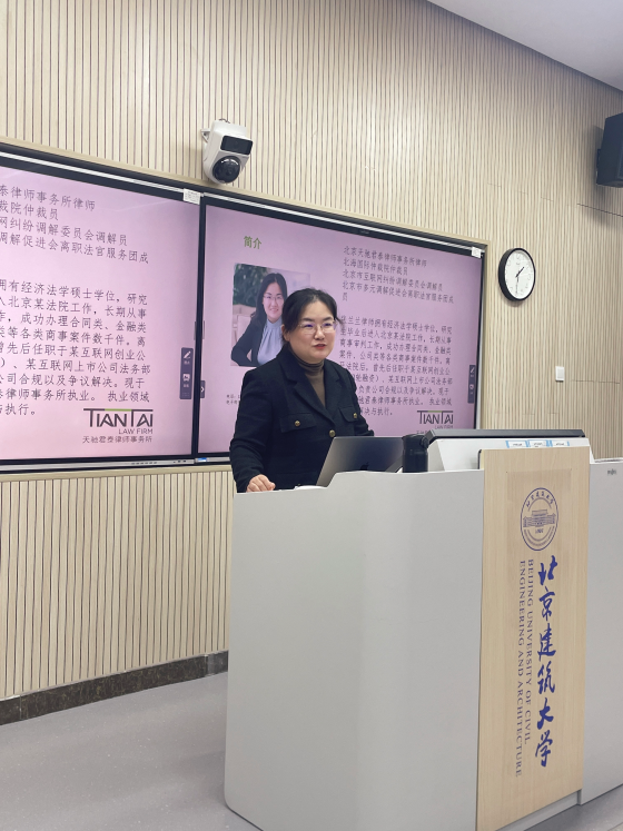 2025年11月7日下午,北京建筑大学法律系顺利举办法律硕士律师实务课程系列讲座第五讲,主题为《民商事案件中的证据问题》。本次讲座特邀北京天驰君泰律师事务所张兰兰律师担任主讲人。