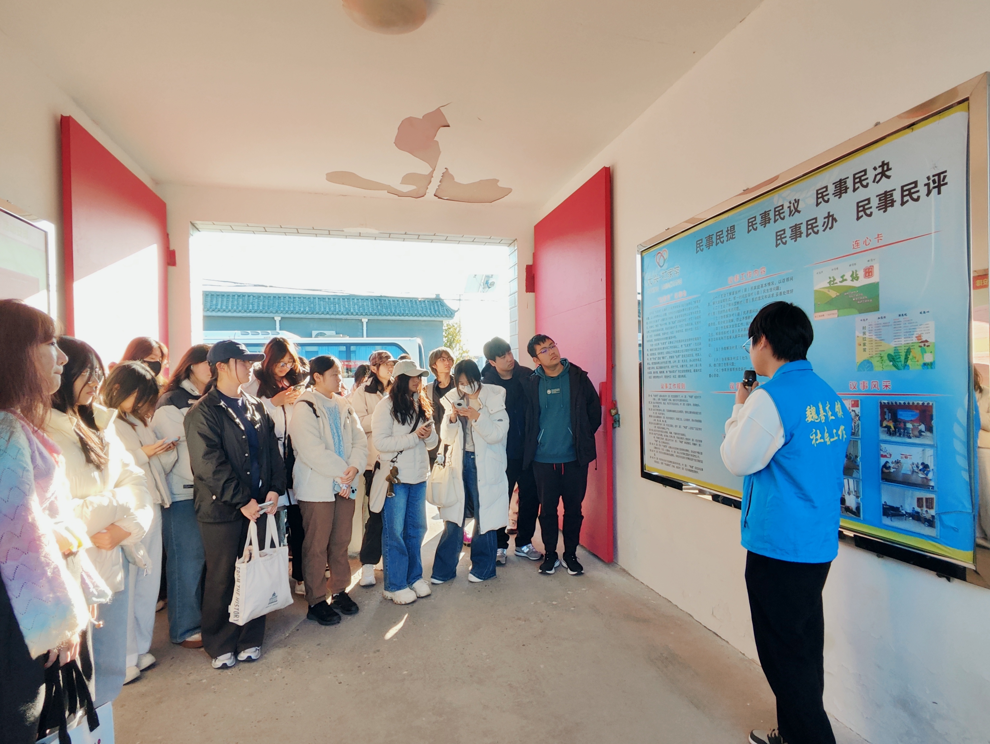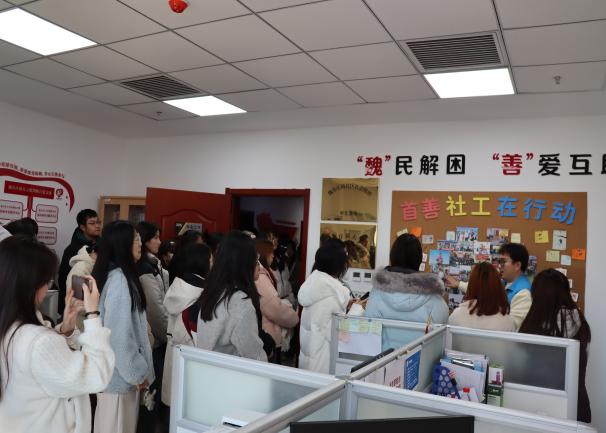 学生首先参观了魏善庄镇社会工作服务中心,工作人员向同学们讲解了中心的场地规划、机制建设、服务成效等内容,中心聚焦心理疏导、智慧养老、妇儿关爱、基层治理与民生保障等问题,以专业社工力量增强基层服务能力,落实民生兜底保障服务,打通党和政府有关民生政策落地的“最后一米”。