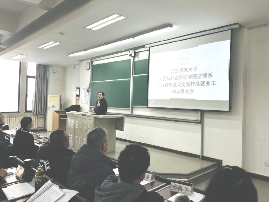 石磊在最后总结中倡议法律系全体师生齐心协力,直面当下就业形势,共促法律系21级就业、论文写作工作顺利开展圆满完成。