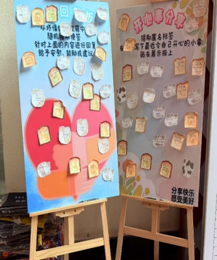 活动设置了“开心事展示板” 、“坏情绪回收箱”和“情绪回复板”。现场氛围热烈,同学们积极参与互动。大家领取便签,在“坏情绪回收箱”倾诉烦恼,也在展示板上分享开心事。组织者随机抽取便签回复,给予鼓励和建议。这些回复温暖了倾诉者,也为他人提供启示。同学们在释放负面情绪的同时,收获了支持与力量。